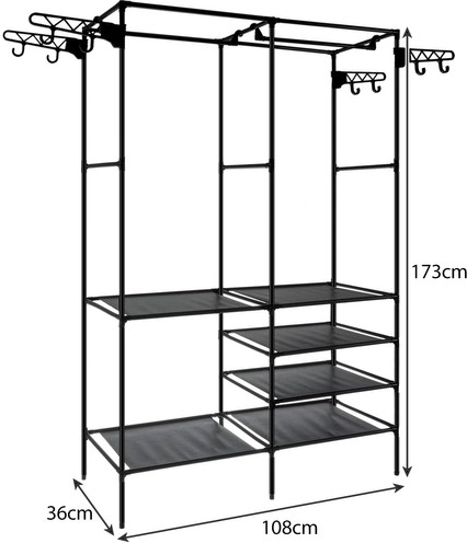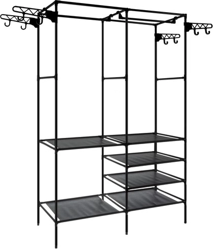Sześć półek, jeden drążek oraz osiem bocznych haczyków pomieszczą ubrania, buty, pudełka i dodatki. Otwarta konstrukcja zapewnia szybki przegląd i łatwy dostęp.