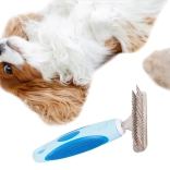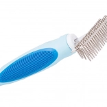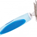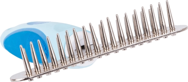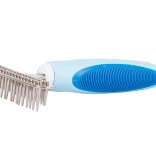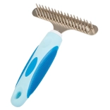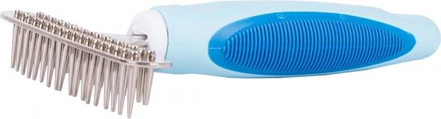 Trymer dla zwierząt domowych jest nieporównywalnie skuteczniejszy niż zwykłe szczotki czy grzebienie. Jego trwałe zęby ze stali nierdzewnej zostały zaprojektowane do efektywnego usuwania martwego podszerstka bez przycinania włosa. Rękojeść pokryta gumowym materiałem zapewnia wygodny chwyt i zapobiega wyślizgiwaniu się z ręki.