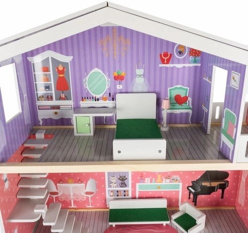 - PREZENTOWY Drewniany domek dla lalek jest przeznaczony dla rodziny 2 lalek. Ma 3 piętra, aż 4 pokoiki i balkon. O tak dużym domu marzy każda lalka! .