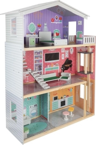- SPECYFIKACJA - kolor: wielokolorowy; materiał: drewno; liczba elementów w zestawie: domek + 9; liczba poziomów: 3; liczba pomieszczeń: 4 + balkon; wymiary (d/s/w): 30,5 x 81,5 x 114 cm; waga: 12,9 kg; waga opakowania: 13,85 kg.