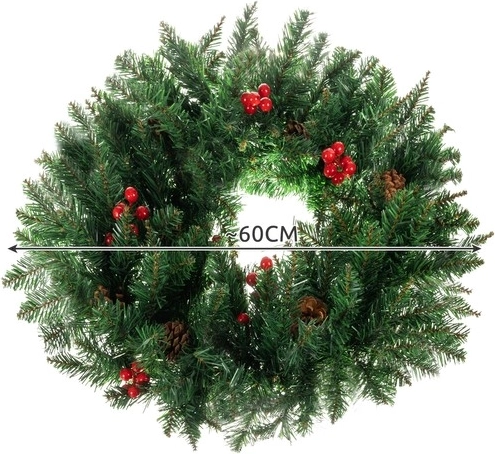 Stylowy design – sztuczny świąteczny wieniec to doskonały dodatek do każdego wnętrza. Z jego pomocą stworzysz wyjątkowe kompozycje nie tylko do salonu, ale także do przedpokoju czy na drzwi wejściowe. Wieniec jest ozdobiony sztucznymi szyszkami i gałązkami z czerwonymi jagodami.