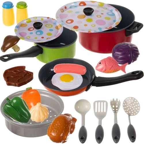 Ten wyjątkowy zestaw zabawek do kuchni pozwala każdemu małemu kucharzowi rozwinąć skrzydła i otworzyć własną restaurację. Składa się z 23 elementów, z którymi Twoje dziecko stworzy pyszne dania. Zestaw zawiera między innymi: garnki, składniki na obiad i akcesoria potrzebne w każdej kuchni. Zestaw będzie idealnym dodatkiem do każdej kuchni do zabawy.
