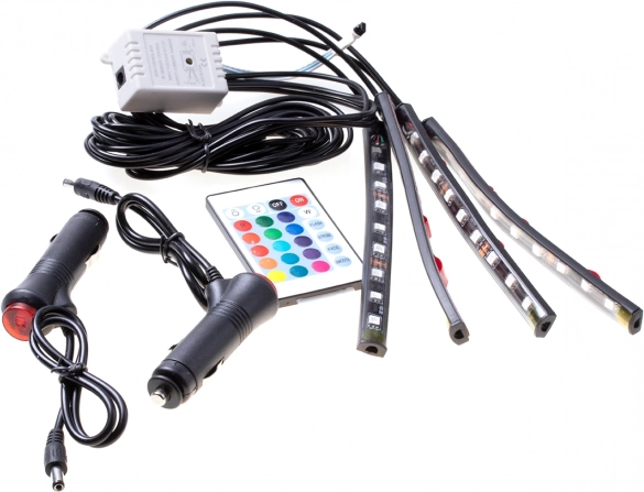 Taśmy LED pozwalają stworzyć oryginalne oświetlenie wnętrza każdego samochodu. Dzięki oświetleniu LED możesz nadać swojemu autu niepowtarzalny charakter. Taśmy pomogą szybko i łatwo przeprowadzić prostą, ale istotną zmianę w Twoim pojeździe. Można je przykleić nad progami, pod siedzeniami, pod drzwiami, w kokpicie, w bagażniku itp. Taśmy LED mocowane są za pomocą dwustronnej taśmy klejącej 3M, dzięki czemu montaż jest bardzo prosty. Taśmy są wodoodporne, więc nie musisz obawiać się wilgoci. Regulując intensywność światła, możesz sam zdecydować, jak dużą część wnętrza chcesz oświetlić. Zasilanie bezpośrednio z gniazda zapalniczki samochodowej – 12 V. Możliwość szybkiego i łatwego wyłączenia dzięki specjalnemu podświetlanemu przyciskowi ON/OFF na wtyku 12 V do zapalniczki.