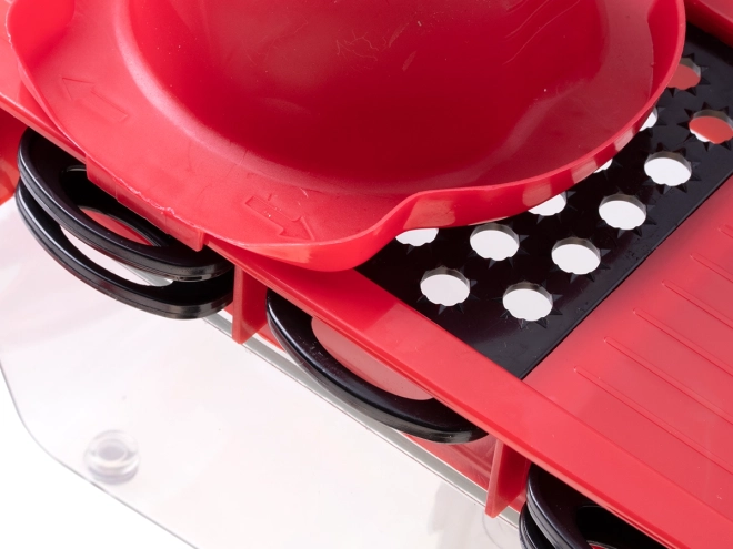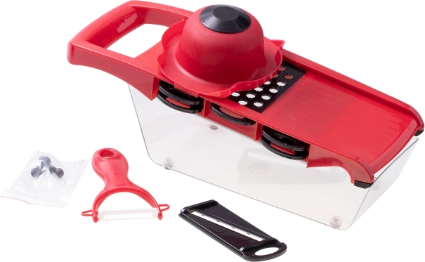 - Sześć wymiennych ostrzy: 2 do Julienne (3 mm i 4 mm), 2 do krojenia (1.0 mm i 1.5 mm), drobne ostrze do tarcia i ostrze do falistych cięć.