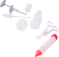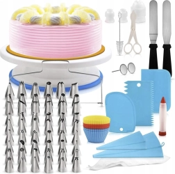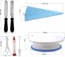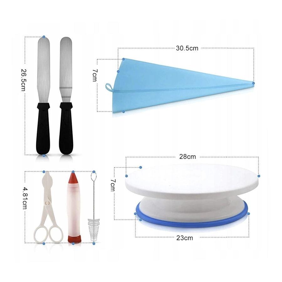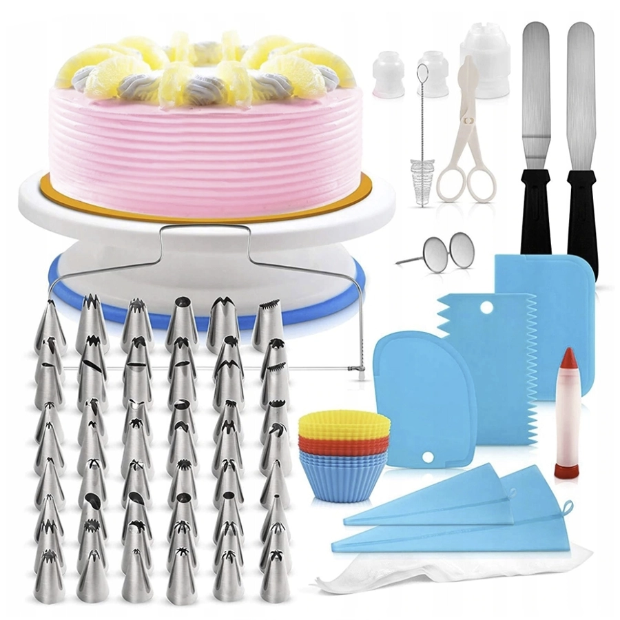 Bardzo rozbudowany i dopracowany zestaw do dekorowania ulubionych tortów, ciasteczek, cupcakes, muffinów itp. Profesjonalny zestaw, który posłuży zarówno początkującym cukiernikom przy domowym przygotowaniu tortów i deserów na urodziny, imieniny lub inne okazje, jak i doświadczonym kuchennym specjalistom. Wykonany z wysokiej jakości plastiku, silikonu i stali nierdzewnej.