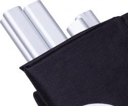 Kosz wykonany jest z wodoodpornego materiału i można go łatwo złożyć, co ułatwia przechowywanie. Prosty system instalacji za pomocą rzepów umożliwia użycie kosza bez stojaka.