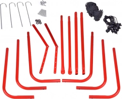 Zawiera cztery kołki zapewniające stabilność i 20 elastycznych linek dla optymalnego napięcia siatki.