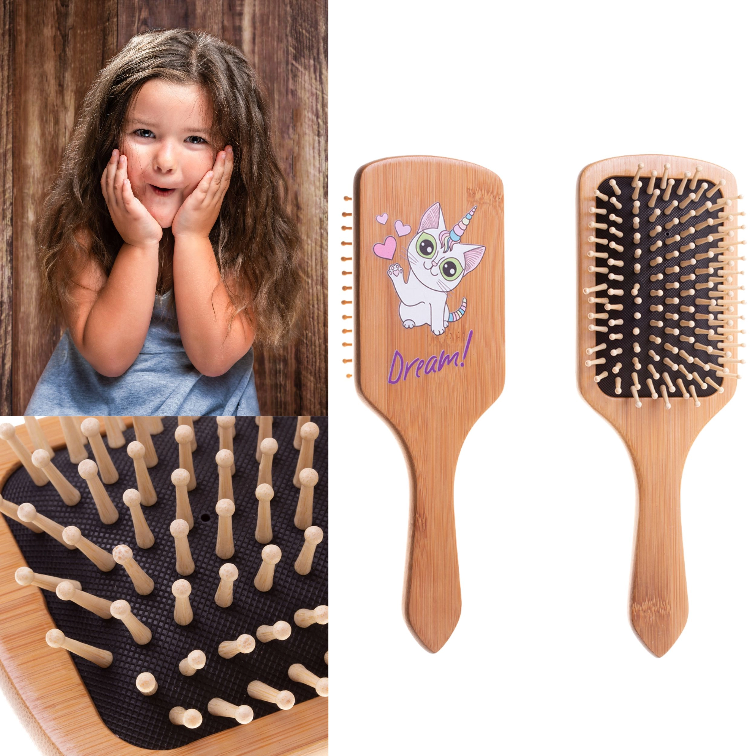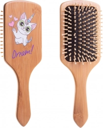 Dzięki naturalnym materiałom szczotka jest trwała, lekka i odpowiednia do prostych oraz falowanych dziecięcych włosów. Zaokrąglone końcówki kołeczków chronią wrażliwą skórę i pomagają równomiernie rozprowadzać naturalne sebum na długości włosów, nadając im naturalny blask. Design z uroczym kocio-jednorożcem i napisem „Dream!” motywuje dzieci do samodzielnego czesania.