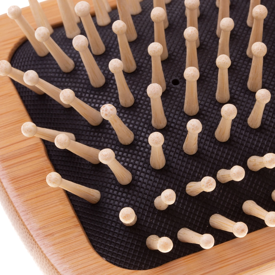 Zaokrąglone drewniane kołeczki na elastycznej podstawie gładko suną po włosach i masują skórę głowy bez podrażnień – idealne dla wrażliwych dziecięcych włosków.