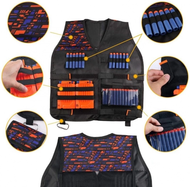 Zawartość zestawu: Zestaw obejmuje taktyczną kamizelkę kuloodporną, okulary ochronne, 30 strzałek, chustę z nadrukiem na twarz, opaskę na nadgarstek do noszenia nabojów oraz dodatkowy magazynek.