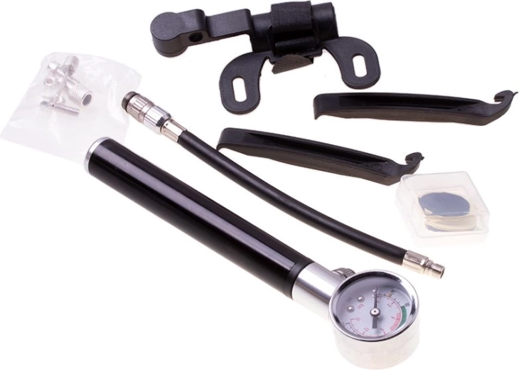 Bardzo praktyczny, mały zestaw do naprawy rowerów z bardzo solidną metalową pompką, wyposażoną w wężyk i manometr.