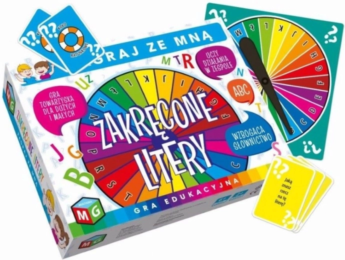 Skręcone literki – to gra polegająca na obracaniu koła za pomocą strzałki. Strzałka zatrzymuje się na konkretnej literze, a Twoim zadaniem jest odczytać wskazaną literę, a następnie prawidłowo odpowiedzieć na pytanie wylosowane z karty.