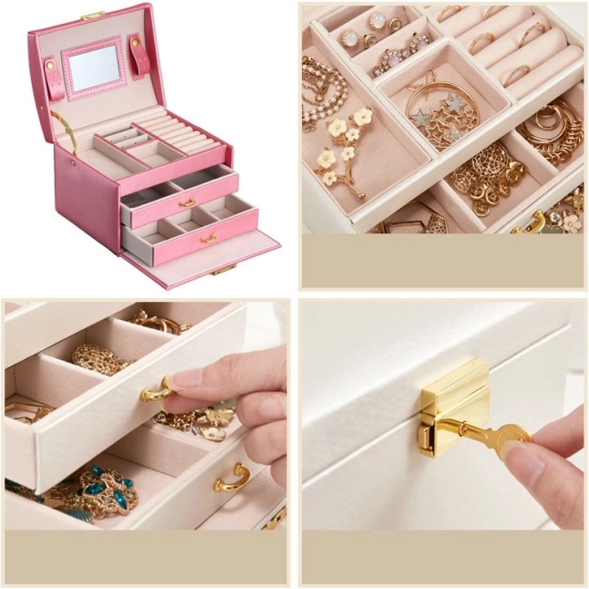 Wśród osobistych przedmiotów każdej kobiety ważną rolę odgrywa biżuteria. Wielopoziomowa szkatułka jest niezastąpionym i niezawodnym produktem do przechowywania Twoich kosztowności. Oddzielne przegródki i szuflady zapewniają idealne miejsce na kolczyki, bransoletki, zegarki, łańcuszki, okulary i inne cenne drobiazgi. Szkatułka na biżuterię eliminuje problem poplątanych łańcuszków, wycierania i zarysowań. Miękka wyściółka chroni Twoją cenną biżuterię przed zarysowaniami. Szkatułka ma duże, wyjmowane lustro, które doskonale sprawdzi się przy przymierzaniu biżuterii i makijażu.