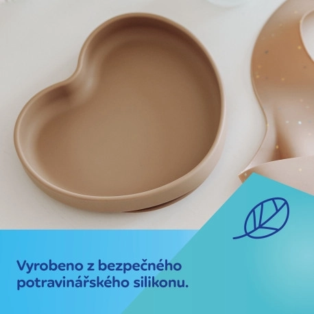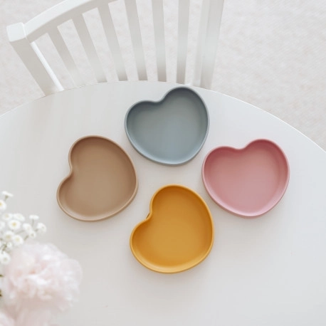 Stylowy dziecięcy talerzyk z bezpiecznego silikonu z praktyczną przyssawką w kształcie serca. Trzyma się stabilnie stołu, jest idealny na pierwsze posiłki i BLW, wytrzymały i elastyczny, odpowiedni do zmywarki i mikrofali oraz bez BPA.