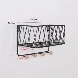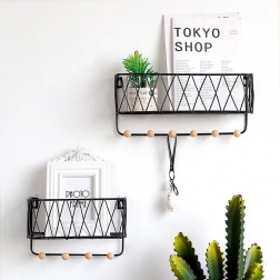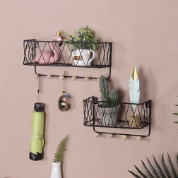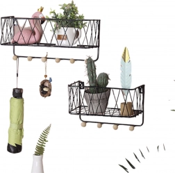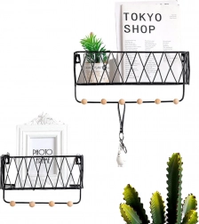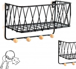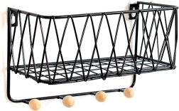 Nowoczesna druciana półka łączy design i funkcjonalność. Górna powierzchnia odkładcza pomieści dekoracje i drobne przedmioty, natomiast dolne haczyki utrzymają klucze, apaszki lub lekkie torby w przejrzystym porządku. Czarne wykończenie łatwo łączy się z większością wnętrz i wygląda czysto oraz ponadczasowo.