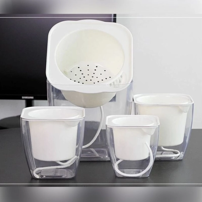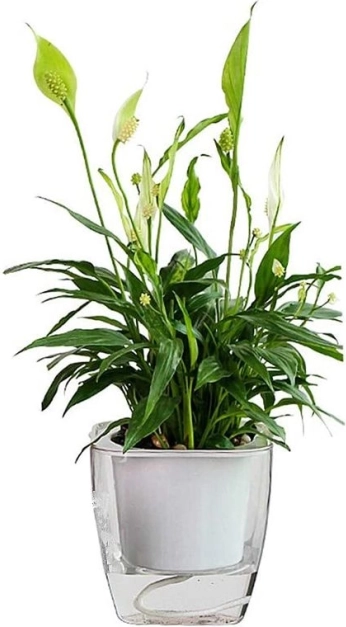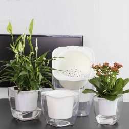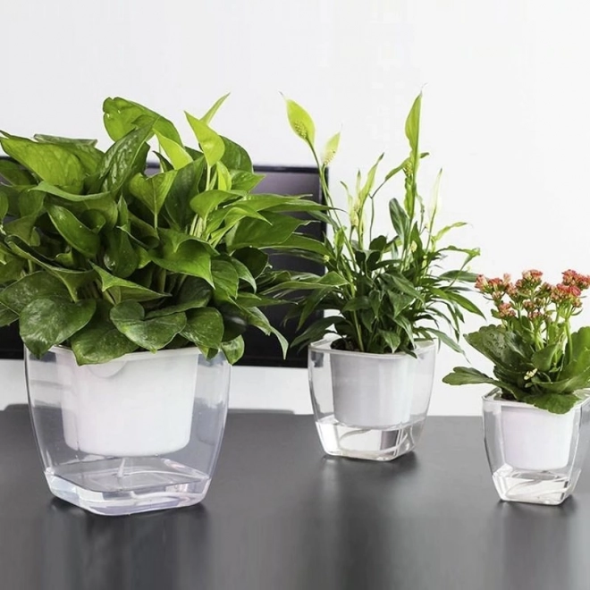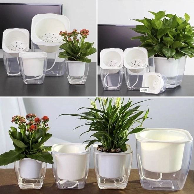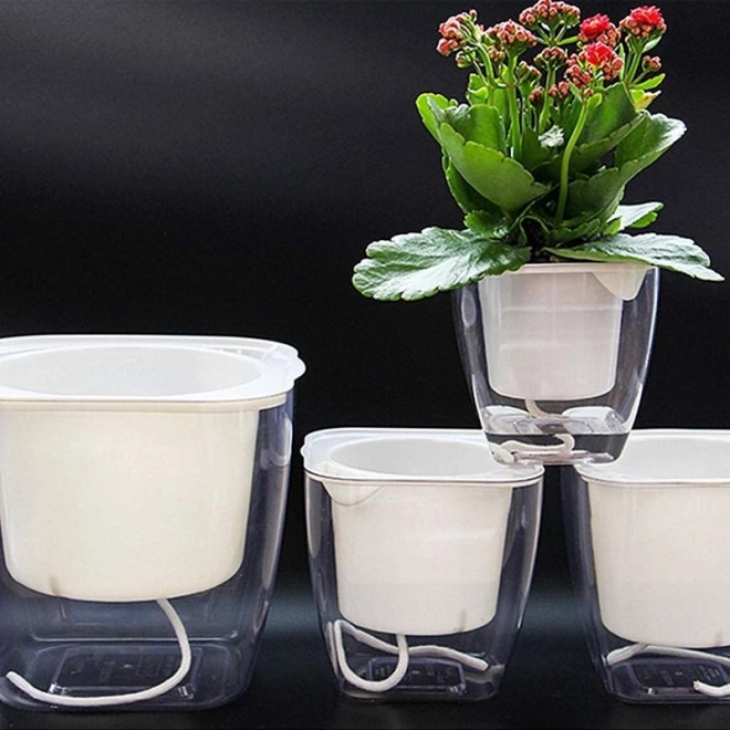 Dekoracyjna doniczka z systemem nawadniania, dzięki któremu Twoje rośliny mają stały dostęp do wody. Nawilżenie roślin utrzymywane jest na stałym, odpowiednim poziomie bez ryzyka przelania lub przesuszenia. Obsługa systemu nawadniania jest bardzo prosta – wystarczy wlać wodę na dno doniczki, a specjalne sznurki doprowadzą do rośliny właściwą ilość wody. Dzięki przezroczystemu wykonaniu możesz łatwo kontrolować poziom wody na dnie doniczki.