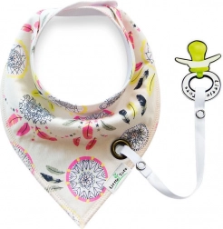 Elegancki śliniaczek dla niemowląt z delikatnym uchwytem na smoczek, idealny jako śliniak przy ząbkowaniu. Dzięki podwójnemu wygodnemu zapięciu na napy nie ogranicza dziecka i pozwala na regulację obwodu.