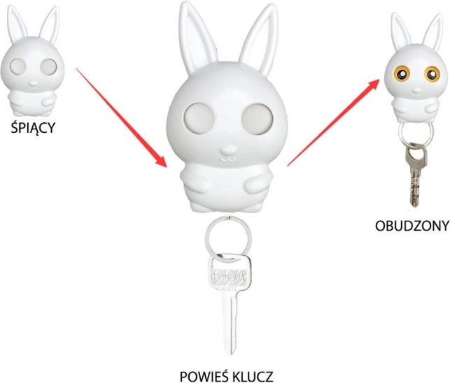 Wieszak na klucze, idealny do przedpokoju, gdzie po powrocie do domu odwiesisz klucze. Gdy tylko je powiesisz, królik „otworzy oczy”, byś mógł mieć na nie oko. Montując wieszak tuż przy wyjściu, już nigdy nie zapomnisz kluczy – otwarte oczy królika z pewnością ci o nich przypomną.