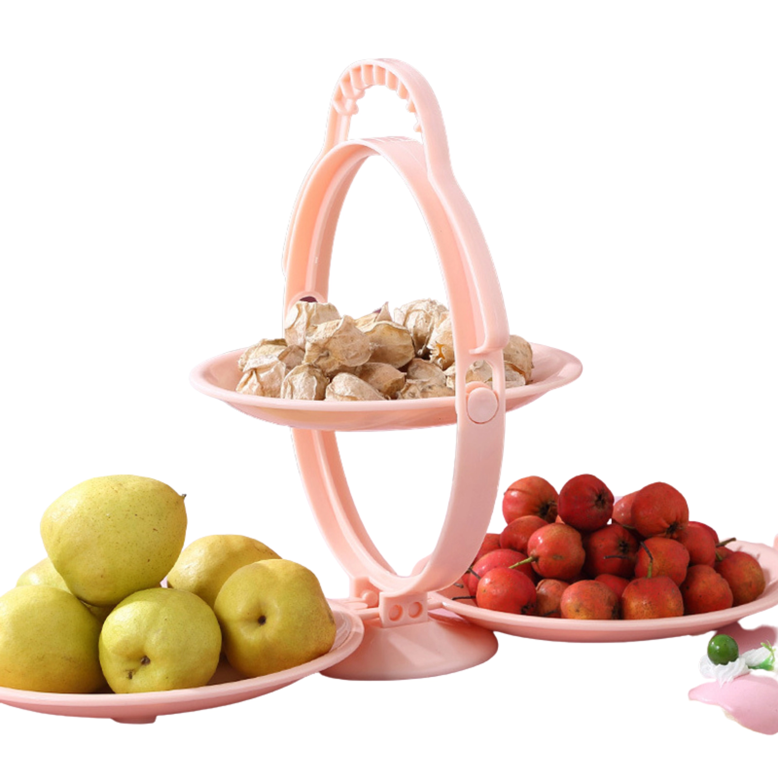 Wnieś na swój stół porządek i styl. Ten różowy, trzypiętrowy, obrotowy i składany stojak jest idealny do serwowania deserów, owoców oraz drobnych słonych przekąsek podczas rodzinnych spotkań i przyjęć. Lekki i wytrzymały plastik jest łatwy w utrzymaniu i nadaje się do codziennego użytku w kuchni, jadalni i salonie.