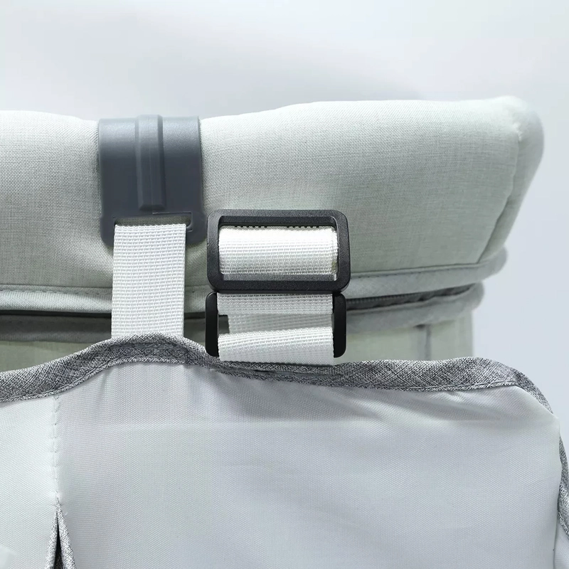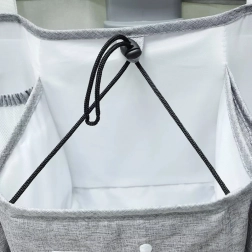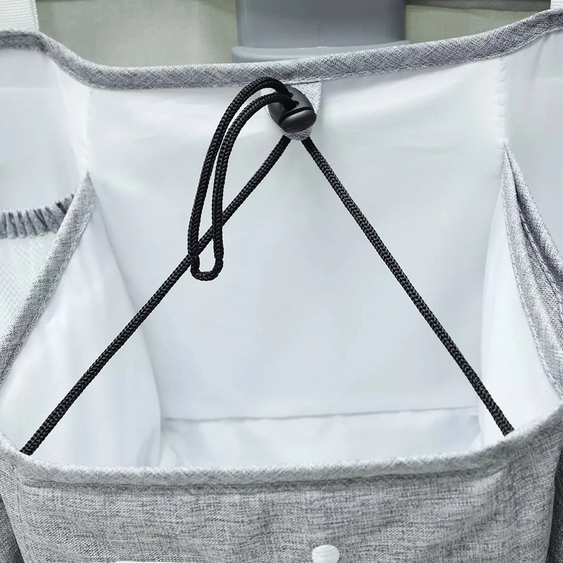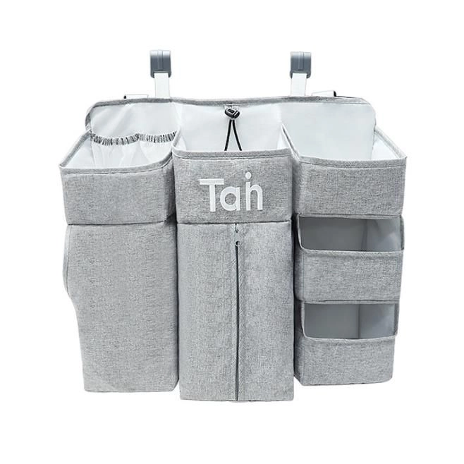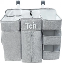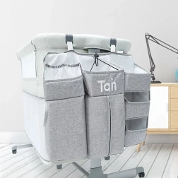 Praktyczny szary organizer na dziecięce łóżeczko utrzyma wszystkie akcesoria dla maluszka przejrzyście pod ręką. Oferuje wiele kieszeni, półki oraz zamykana na zamek kieszeń na pieluchy, siatkowe kieszenie na drobiazgi i uniwersalne mocowanie do łóżeczka, przewijaka, drzwi lub szafy.