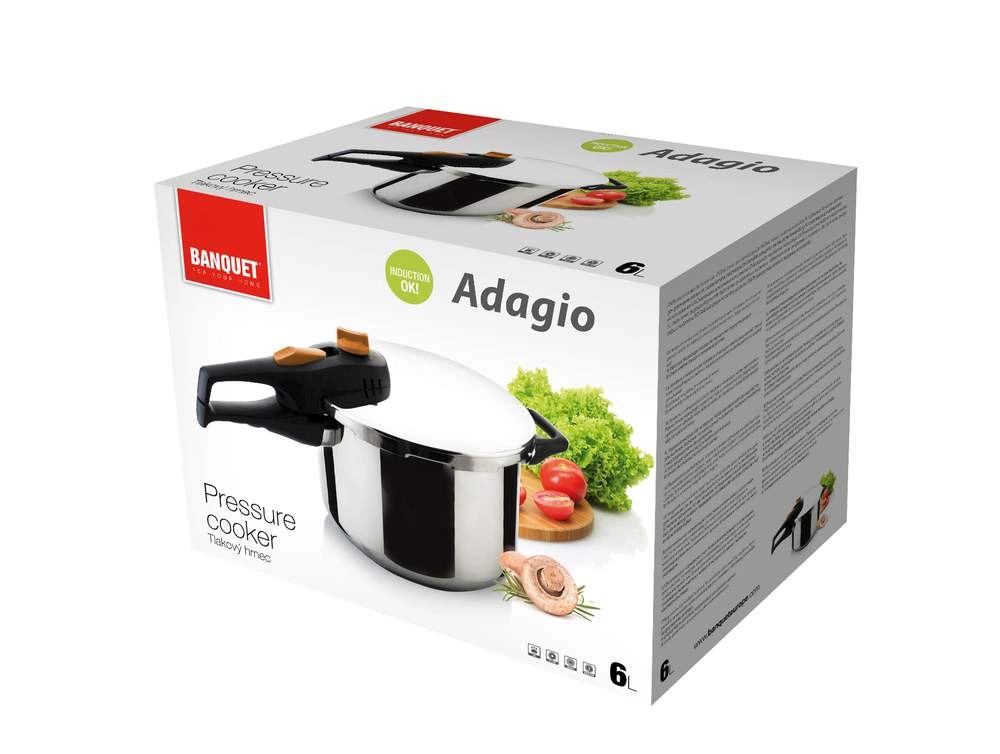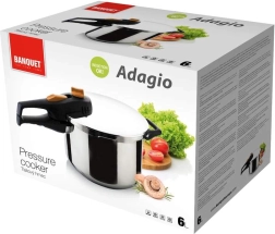 Szybkowar BANQUET ADAGIO o pojemności 6 litrów przyspieszy przygotowanie ulubionych dań, zachowa więcej witamin i minerałów, a jednocześnie zaoszczędzi czas i energię. Solidna stal nierdzewna 18/8, ścianka o grubości 1 mm oraz mocne, kanapkowe dno 5 mm zapewniają stabilne nagrzewanie i długą żywotność. Bezpieczne zamknięcie bagnetowe, otwór roboczy oraz zabezpieczenie przed otwarciem pod ciśnieniem gwarantują spokojne i wygodne użytkowanie.