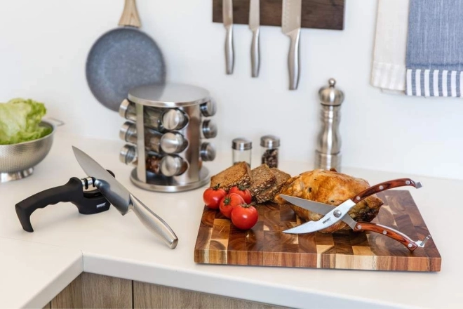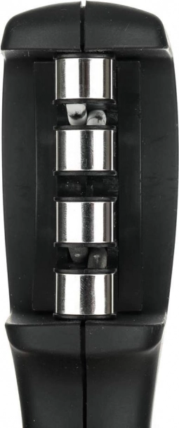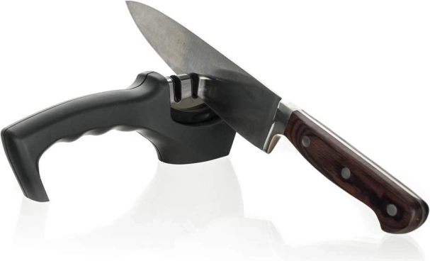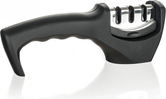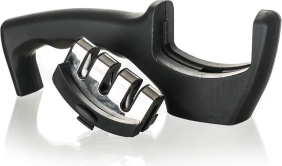 Wykonany z tworzywa ABS z powłoką soft touch oraz antypoślizgową podstawą dla łatwej i bezpiecznej obsługi. Ostrzałka jest odpowiednia dla praworęcznych i leworęcznych i ma 3 kamienie szlifierskie. Kamień diamentowy służy do naprawy uszkodzonych ostrzy i ich wyrównania przed ostrzeniem. Kamień wolframowy ostrzy ostrze i przywraca jego optymalny kształt. Trzeci kamień jest ceramiczny i służy do polerowania ostrza oraz usuwania powierzchniowych zadziorów.