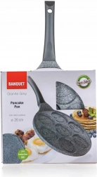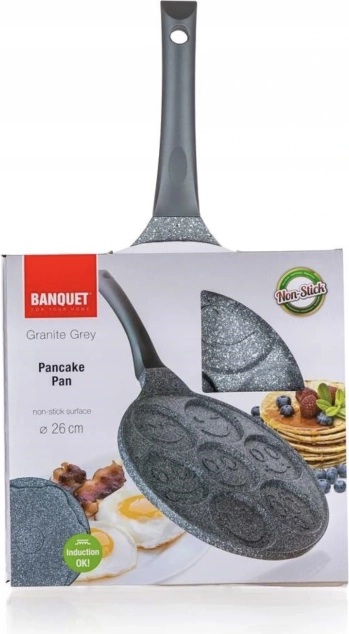 Patelnia BANQUET Granite Gray Smile ucieszy dzieci i dorosłych. Siedem okrągłych wgłębień (8 cm) pozwala przygotować równomiernie wypieczone placuszki, naleśniki lub jajka sadzone dzięki masywnemu korpusowi o grubości 4 mm z doskonałą akumulacją ciepła. Nieprzywierająca, dwuwarstwowa powłoka Dyflon minimalizuje przypalanie i ułatwia gotowanie przy mniejszej ilości oleju.