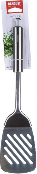Łopatka do przewracania z otworami Banquet Akcent to idealne narzędzie do wygodnego manipulowania jedzeniem podczas gotowania. Jest wykonana z wysokiej jakości stali nierdzewnej, co zapewnia długą żywotność i odporność na korozję. Dzięki praktycznemu oczku można ją łatwo zawiesić.