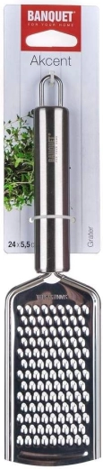 Praktyczna i trwała tarka ze stali nierdzewnej 24 cm Akcent do profesjonalnego i domowego użytku. Oferuje łatwą pielęgnację, możliwość mycia w zmywarce oraz oczko do zawieszania dla oszczędnego przechowywania.