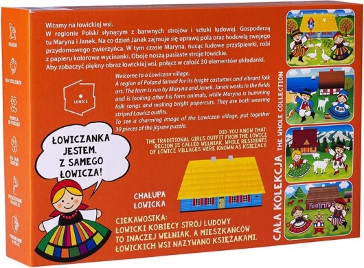 Puzzle – wieś łowicka. W podróży po najpiękniejszych zakątkach Polski czas zatrzymać się w miejscu słynącym z barwnych strojów i sztuki ludowej. Puzzle – łowicka wieś przedstawiają obraz wsi łowickiej, jej codzienne życie i fascynujące tradycje. Po wsi łowickiej oprowadzą nas Maryna i Janek. Codzienność Janka to praca w polu i opieka nad zwierzętami gospodarskimi: krowami, świniami, kurami i gęsiami. Maryna w tym czasie tworzy kolorowe wycinanki z papieru i nuci ludowe piosenki. Oboje dumnie noszą piękne, pasieste łowickie stroje. Aby zobaczyć piękny obraz łowickiej wsi, trzeba ułożyć 30 elementów układanki. Podczas układania puzzli – łowicka wieś dziecko poznaje symbole i zwyczaje związane z danym regionem Polski. Dodatkowo puzzle zapakowano w pudełko ozdobione opowieściami, ciekawostkami i przyśpiewkami.
