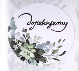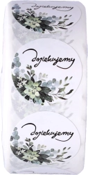 Okrągłe naklejki z napisem „Dziękuję” mają średnicę 2,5 cm. W jednym zakupionym zestawie znajduje się łącznie 500 naklejek. Naklejki są samoprzylepne i wykonane z materiałów najwyższej jakości. Doskonale ozdobią pudełka, opakowania, etykiety, koperty, albumy, torby itp.