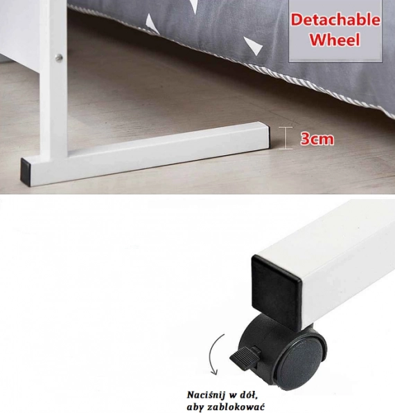 Blat jest osadzony na specjalnie zaprojektowanej ramie, która umożliwia wygodne użytkowanie nawet w łóżku. Cztery kółka u podstawy pozwalają na szybkie i bezpieczne przestawianie całości. Aby zablokować kółka w stoliku, wystarczy wcisnąć blokadę. Podpory można bardzo szybko zdemontować. Stolik jest idealny do salonu, sypialni lub kuchni. Ogromną zaletą naszego stolika jest regulowana wysokość, dzięki czemu dopasujesz go do własnych potrzeb. Regulacja wysokości w zakresie 70–90 cm. Kolejnym atutem jest uniwersalne i bardzo stylowe wykończenie kolorystyczne.
