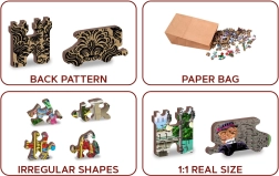 Nie przegap okazji, aby odkryć piękno unikalnie ukształtowanych elementów naszego WOODEN CITY puzzle. Każdy element jest wycięty laserowo, a niektóre w kształcie zwierząt, budynków czy przedmiotów, co zwiększa estetyczną wartość rezultatu. Puzzle są dwustronne, więc możesz je składać według zdjęcia lub wzoru na drugiej stronie.