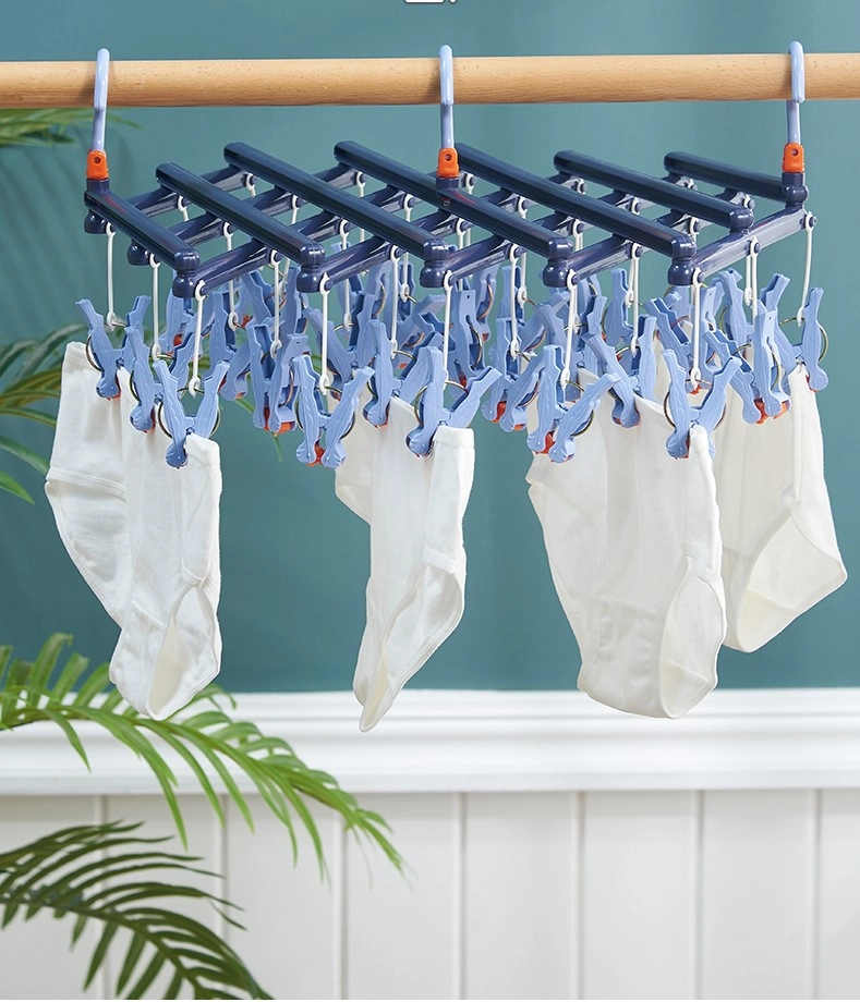 Praktyczna składana suszarka z 14 klamerkami jest idealna do suszenia drobnej bielizny, takiej jak skarpetki, majtki czy ubranka dziecięce. Dzięki obrotowemu haczykowi i kompaktowym wymiarom oszczędza miejsce i nadaje się do użytku w domu i na zewnątrz. Wytrzymałe tworzywo, składana konstrukcja oraz bezpieczne klamerki zapewniają wygodne i skuteczne suszenie bez zsuwania się prania.