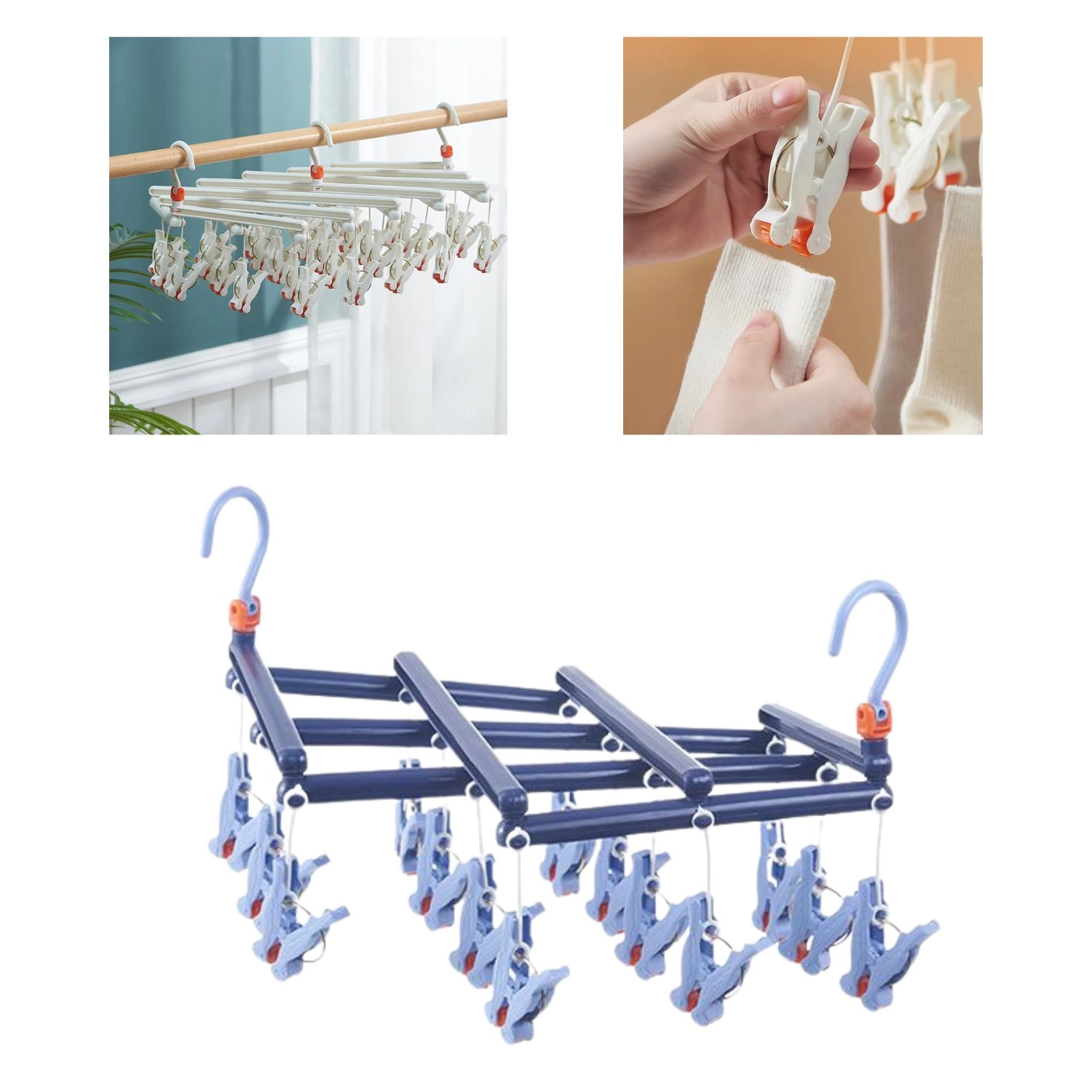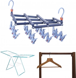 Odkryj niezawodne rozwiązanie do codziennego suszenia drobnego prania. Składany suszak z 14 solidnymi klipsami wykonany jest z wysokiej jakości plastiku odpornego na wilgoć, dzięki czemu możesz go bez obaw używać w domu i na zewnątrz. Obrotowy haczyk z blokadą zapewnia stabilne zawieszenie w dowolnym miejscu — na balustradzie balkonu, suszarce, drążku w szafie czy kempingowej lince.