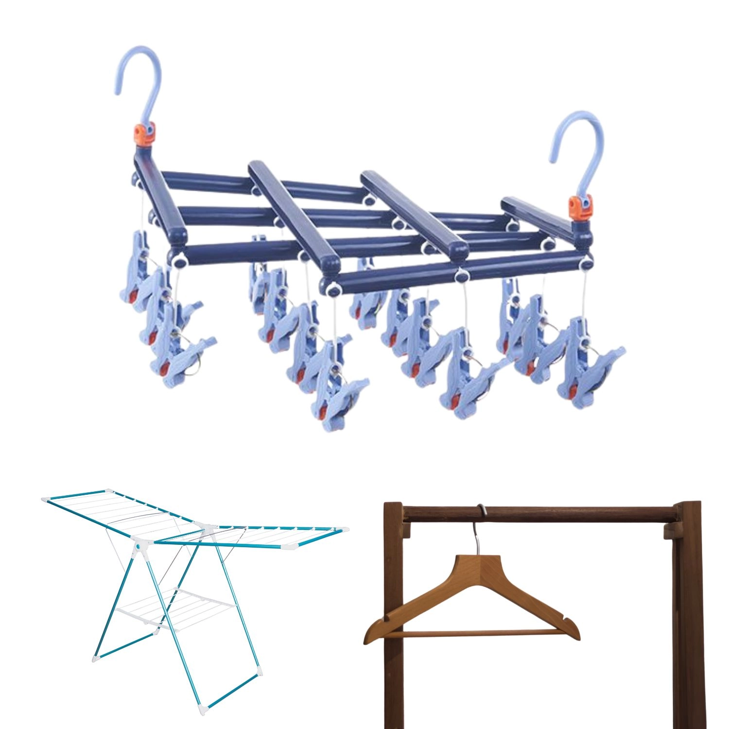 Dzięki kompaktowym wymiarom po złożeniu oszczędza miejsce w szafie i podczas transportu. Ergonomiczne klipsy z perforacją pewnie trzymają tkaninę, a jednocześnie są delikatne dla materiałów, więc pranie nie zsuwa się ani nie odkształca. Ciemnoniebieskie wykończenie dodatkowo wygląda czysto i elegancko.