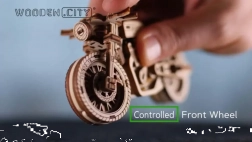 Motocykl Café Racer od WOODEN CITY to szczegółowo dopracowany drewniany model w skali 1:16, który ożywi Twoje biurko lub gablotę. Dzięki gumkowemu silnikowi i mechanizmowi cofania model porusza się do przodu i do tyłu, osiąga zasięg około 1 metra i pozwala podziwiać prawdziwą mechanikę przekładni.