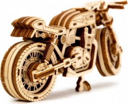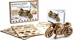 Złóż stylowy motocykl Café Racer z naturalnej sklejki i ciesz się jego funkcyjną mechaniką. Model dzięki mechanizmowi cofania i silnikowi gumkowemu pojedzie aż na 1 metr, ma gumowane koła, mechanizm bezwładnościowy oraz realistyczne elementy sterujące. Składanie odbywa się bez kleju i narzędzi, a opakowanie posłuży jako stojak.