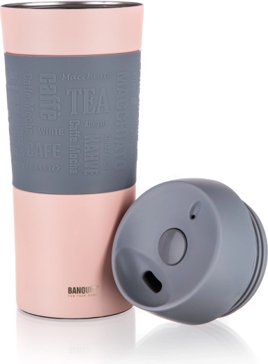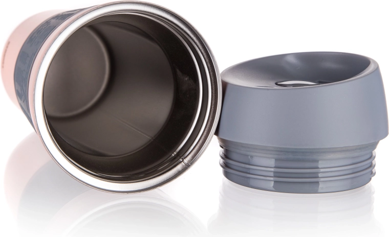 Matowy kubek z podwójną ścianką, odpowiedni do zimnych i gorących napojów. Część zewnętrzna wykonana ze stali nierdzewnej 201, a część wewnętrzna ze stali nierdzewnej 304. Użyteczna pojemność 420 ml.