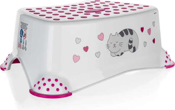 Podaruj dzieciom większą samodzielność w łazience i kuchni. Dziecięcy stołek z motywem kotka zapewnia bezpieczny dodatkowy stopień, gdy trzeba sięgnąć wyżej. Antypoślizgowe punkty na górnej powierzchni oraz gumowe zakończenia nóżek minimalizują ryzyko poślizgnięcia.