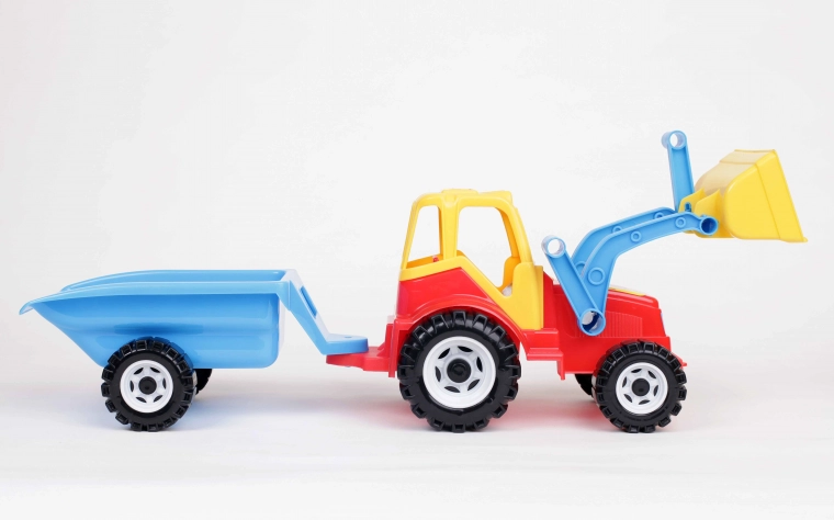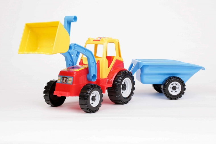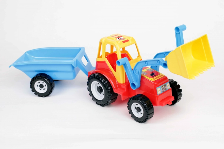 Traktor z ładowaczem czołowym z możliwością podnoszenia łyżki, gotowy do przewożenia załadowanego piasku. Kolorowy plastikowy traktor jest z tyłu wyposażony w podłączoną dwukołową przyczepę, która przypomina duży taczki. Dzięki dwuosiowemu rozwiązaniu przyczepa po odłączeniu łatwo odchyla się do tyłu, co umożliwia wysypanie zawartości. Traktor jest dodatkowo ozdobiony ciekawymi naklejkami imitującymi światła.
