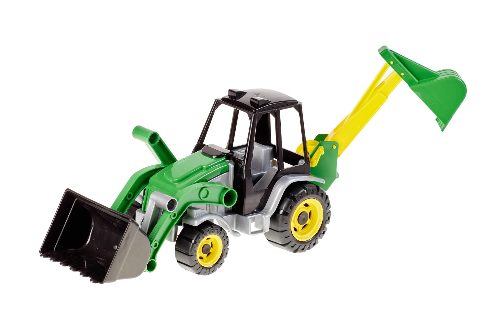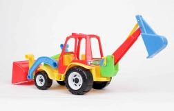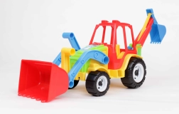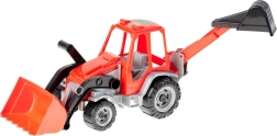 Ten dwufunkcyjny traktor z koparką oferuje dzieciom realistyczną zabawę budowlaną. Dzięki ruchomej przedniej łyżce i tylnej łyżce kopiącej mogą przenosić, ładować i wykopywać wyimaginowany materiał. Wytrzymała konstrukcja nadaje się do zabawy w pomieszczeniach i na zewnątrz.