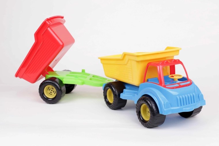 Samochód wywrotka z przyczepą skrętną; zestaw idealny do zabawy w piaskownicy lub na plaży. To świetna rozrywka dla małych budowniczych, ponieważ zarówno samochód, jak i przyczepa umożliwiają transport zabawek i piasku. Przyczepę można odłączyć.