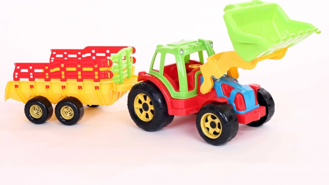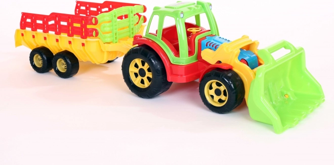 Ten traktor z przyczepą i ładowaczem to niezbędnik dla każdego małego rolnika. Zestaw ten jest wykonany z oryginalnych materiałów i barwników, które nie zawierają związków metali ciężkich, dlatego spełnia wszelkie warunki bezpieczeństwa.