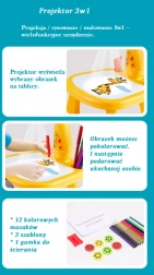 Wystarczy włożyć wybraną tarczę z szablonami, włączyć projektor i zabawa może się zacząć. Powierzchnia do rysowania umożliwia łatwe ścieranie i wielokrotne tworzenie, a w razie potrzeby można użyć zwykłego białego papieru i podarować gotowy obrazek rodzicom lub pani nauczycielce.
