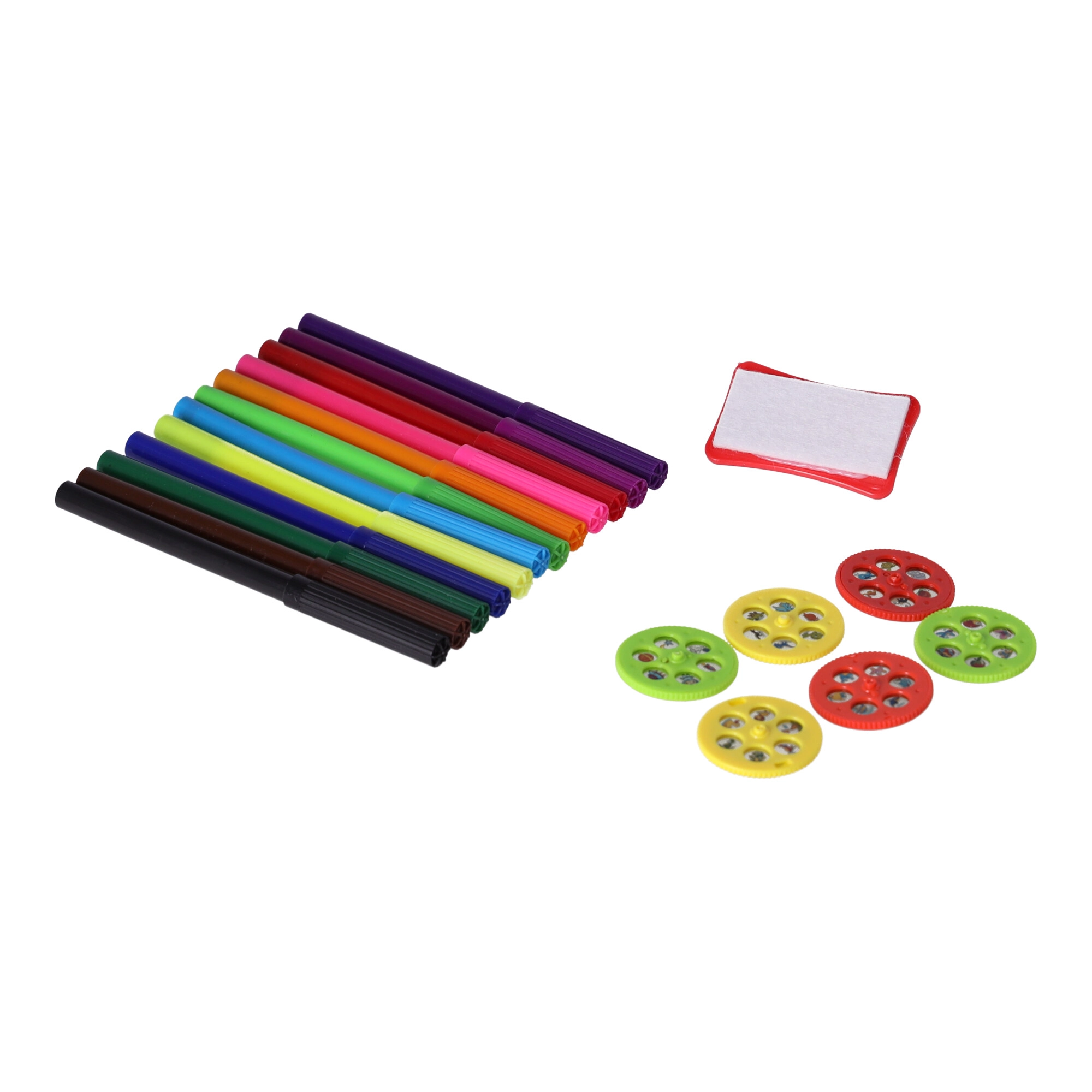 W zestawie znajdziesz 6 tarcz z szablonami, 12 kolorowych markerów, papier i gumkę. Dzieci mogą tworzyć od razu po rozpakowaniu.