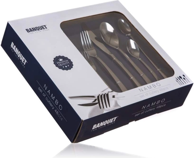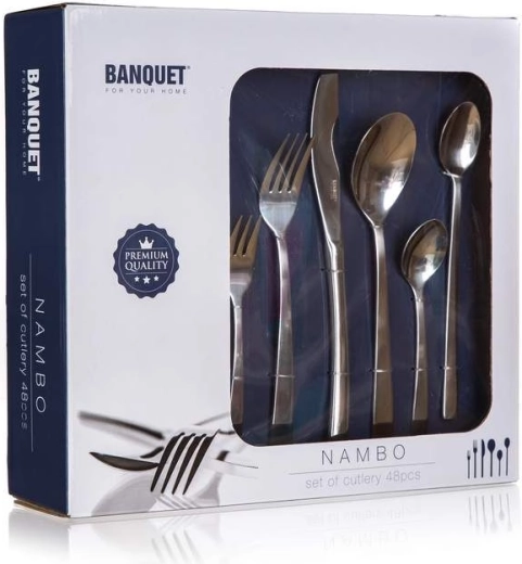 Zestaw sztućców BANQUET NAMBO w liczbie 48 elementów to idealny wybór do rodzinnych posiłków i przyjęć. Wyważony kształt i lśniące wykończenie ze stali nierdzewnej 18/0 nadają Twojemu stołowi nowoczesny i czysty wygląd.
