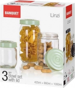 Zestawu 3 pojemników LINZI o pojemności 425 ml, 660 ml i 1000 ml można używać praktycznie do wszystkich produktów spożywczych, czy to przypraw, makaronu, czy cukru. Szklany pojemnik ma szczelnie przylegającą pokrywkę w dekorze granitowym.