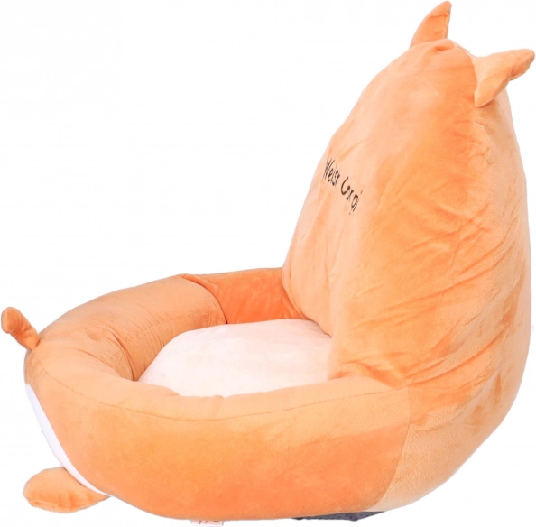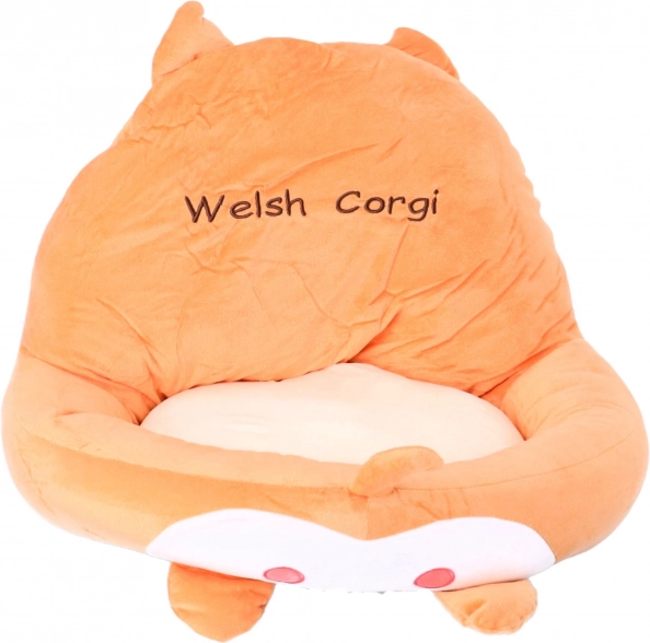Poduszka w zabawnym wzorze psa corgi jest ozdobiona żywymi kolorami i dekoracyjnym napisem.