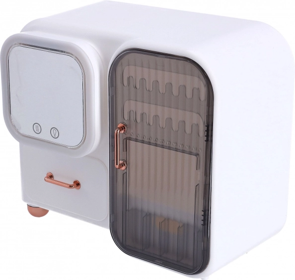 Wbudowane lustro jest wyposażone w oświetlenie LED z trzema różnymi efektami świetlnymi: ciepłym, naturalnym i zimnym. Lustro jest obrotowe i skrywa dodatkową przestrzeń na akcesoria kosmetyczne. Dzięki wbudowanemu wentylatorowi Twój makijaż szybciej wyschnie.